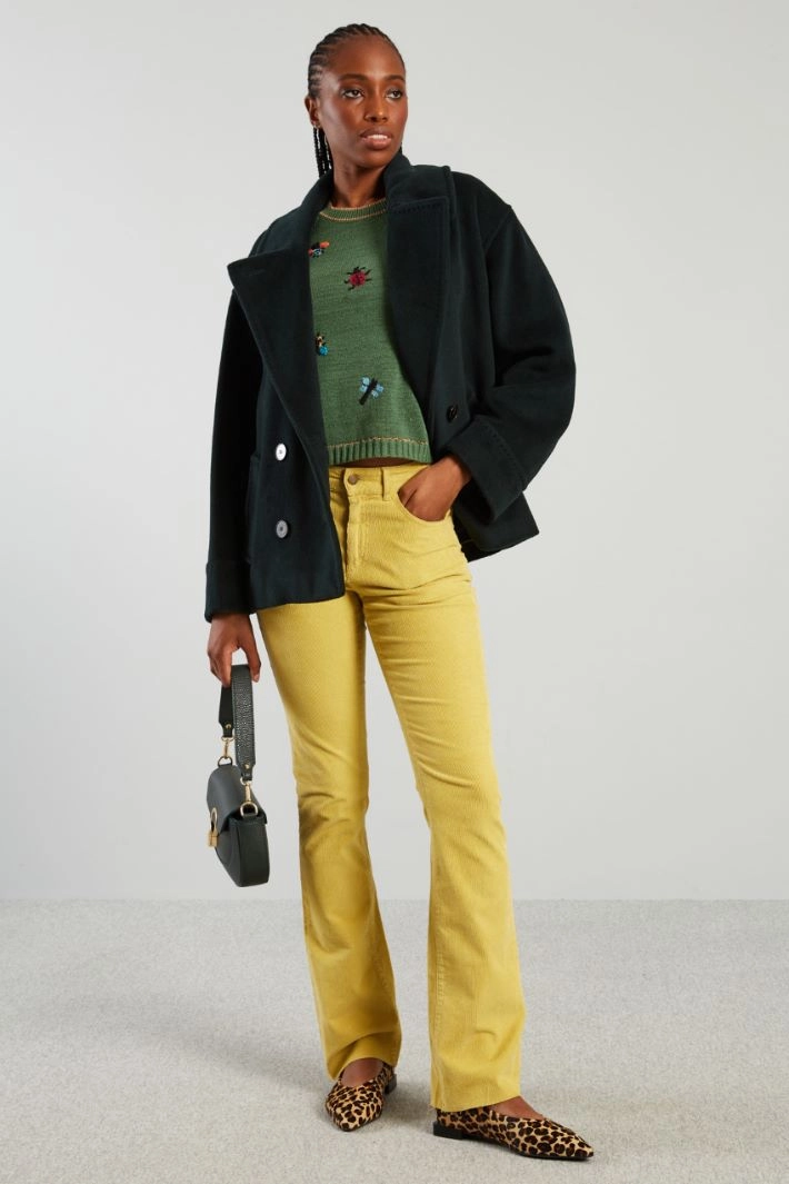 Pantalones de corte acampanado realizados en terciopelo acanalado de algodón elástico, con trabillas en la cintura, cinco bolsillos y bajo sin rematar. Cierre con cremallera oculta y botón metálico.