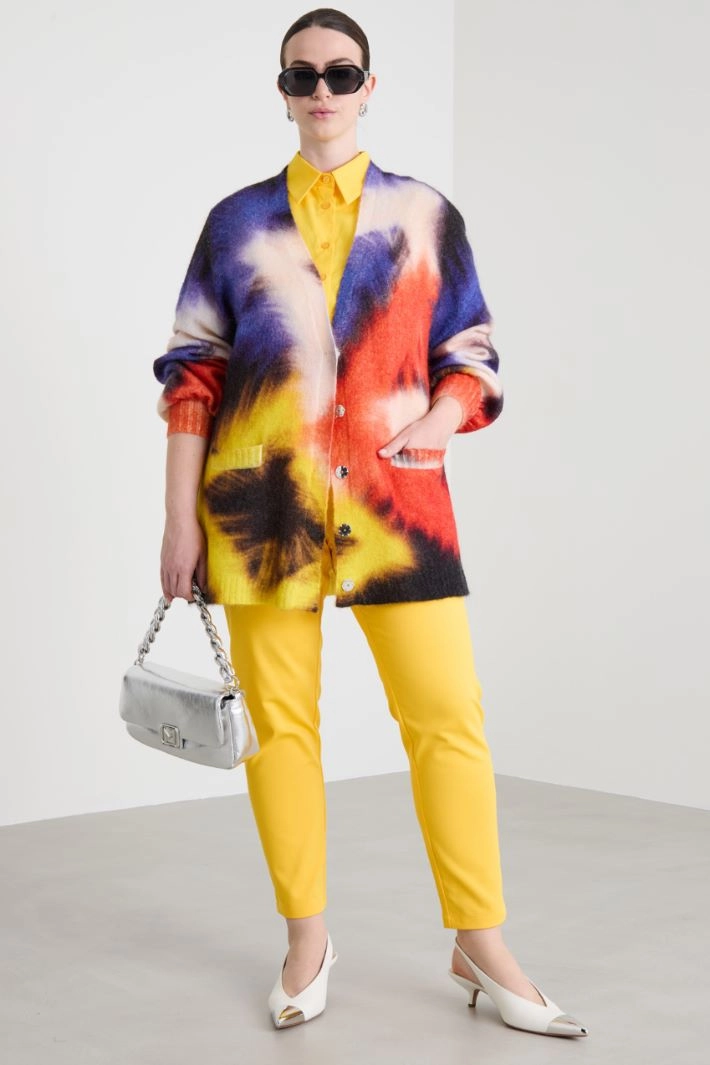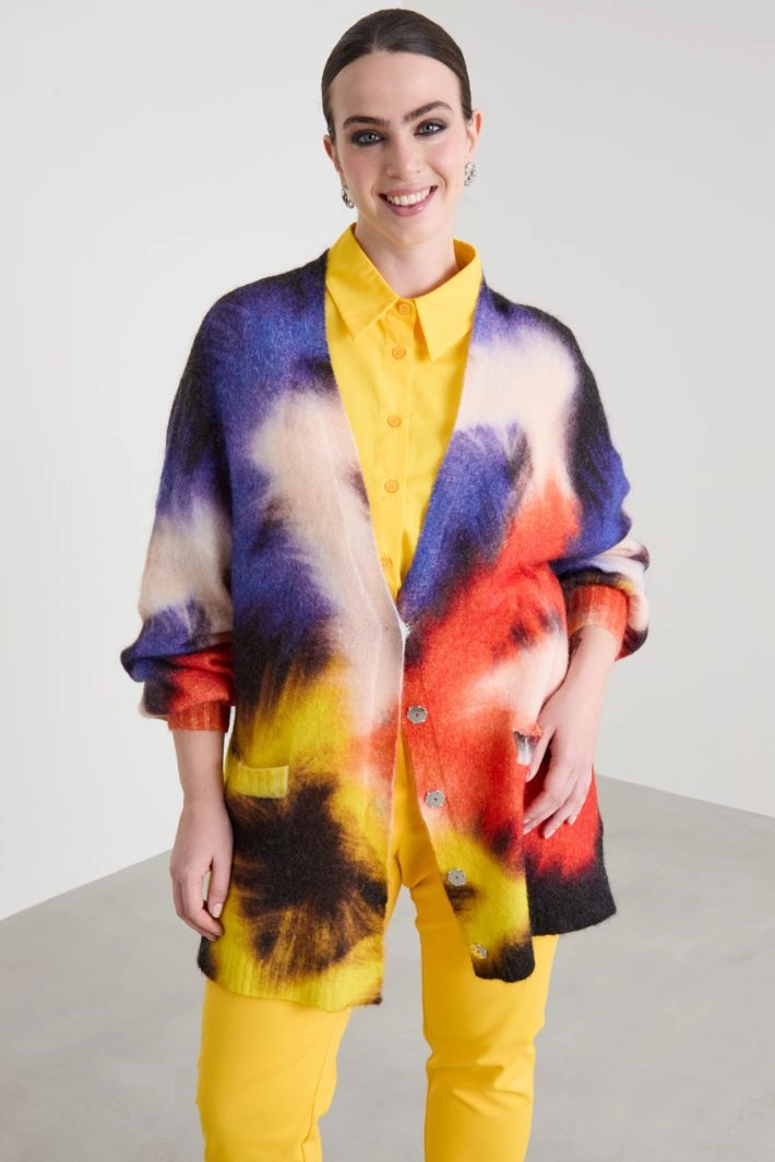 Cárdigan estampado de corte suave realizado en mezcla de lana y mohair elástico, con cuello en pico, mangas largas, ribetes de canalé y cierre con botones a presión ocultos.