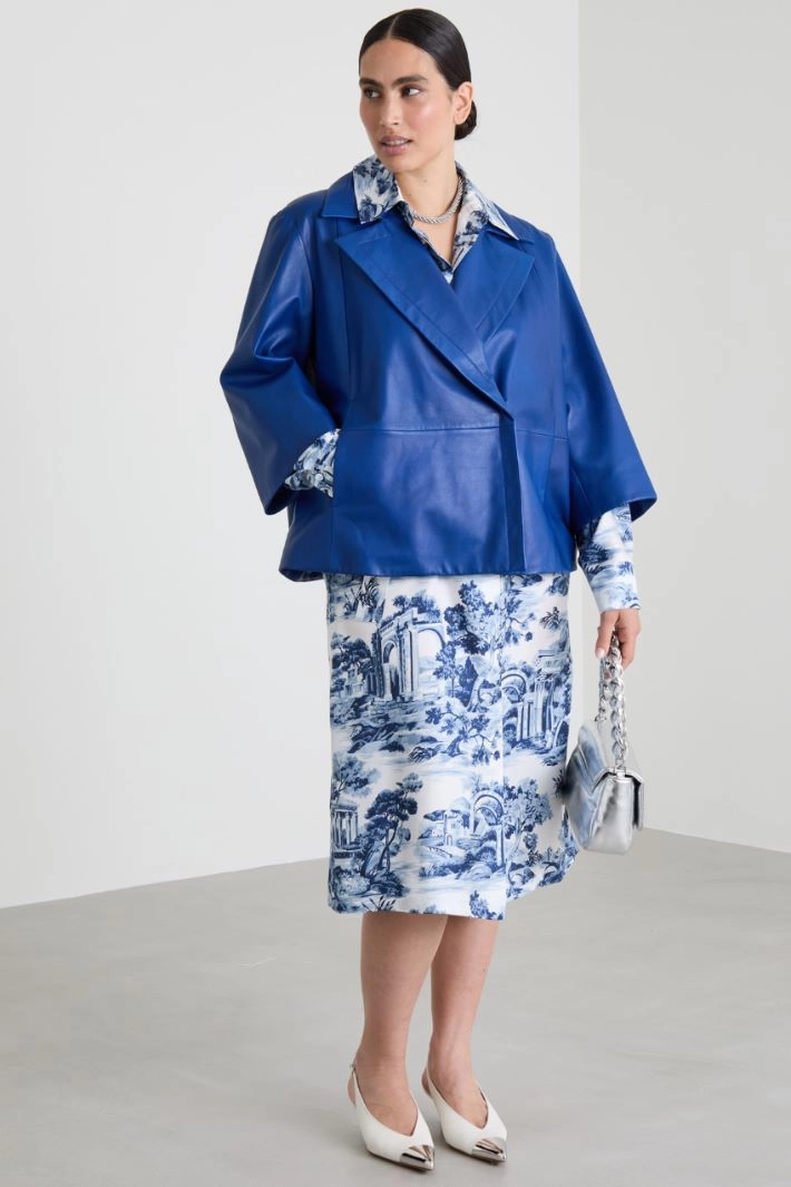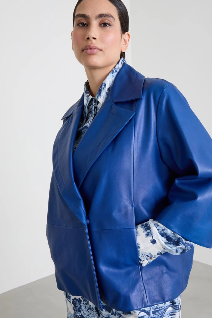 Chaqueta ligeramente evasé realizada en auténtica piel napa, con cuello solapa, mangas tres cuartos y bolsillos cosidos en los laterales. Cierre cruzado con botones a presión. Forrada.