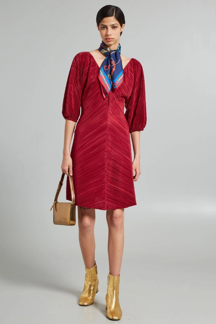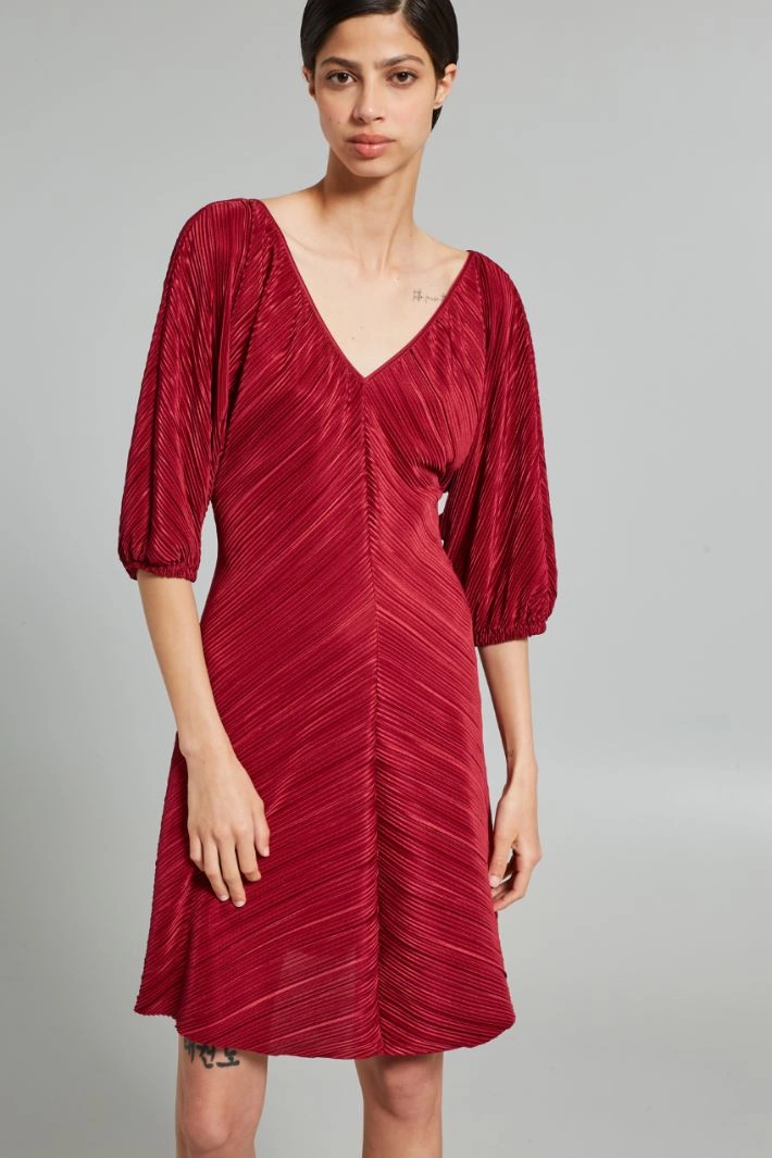 Vestido corto y acampanado realizado en punto de acabado brillante, con diseño plisado, escote en V tanto en la parte delantera como en la trasera y mangas kimono de tres cuartos con goma en la parte inferior.
