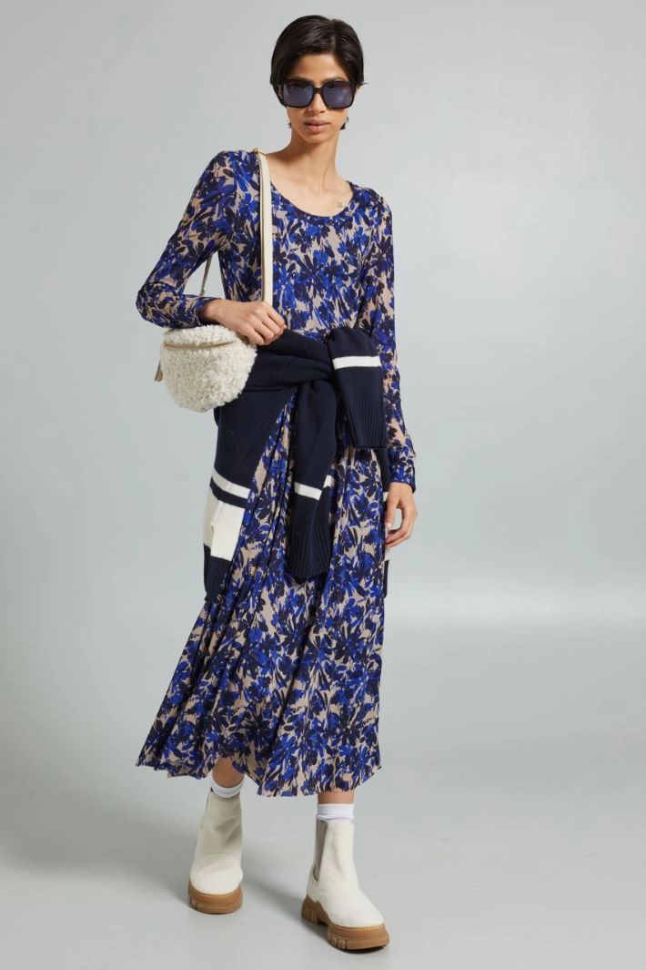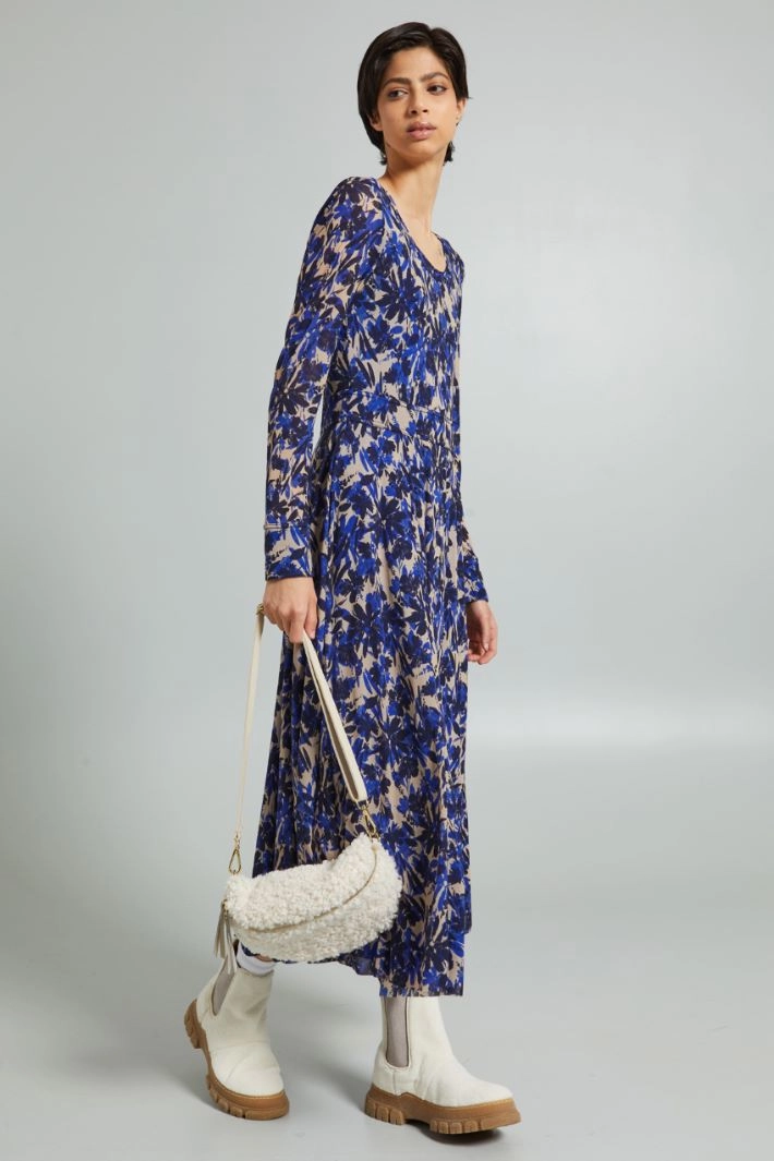 Vestido largo, de corte fluido, realizado en punto de media estampado, con cuello redondo, cintas para anudar en la parte trasera, cinturilla y mangas largas con puño. Cierre con cremallera invisible en el lateral. Parcialmente forrado.