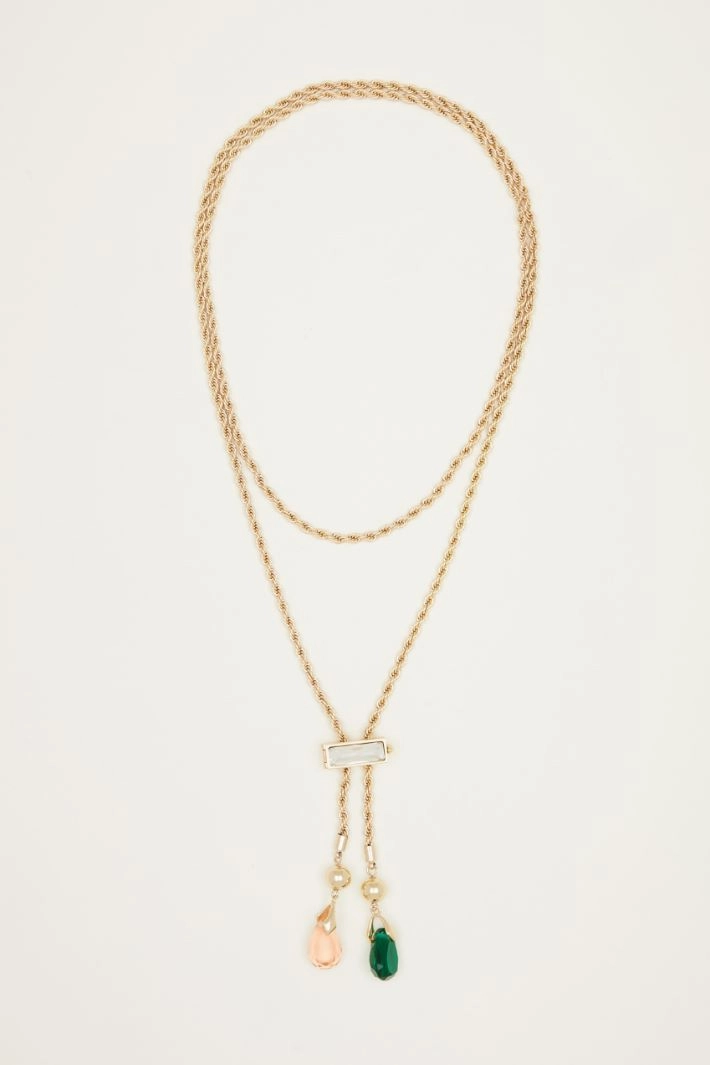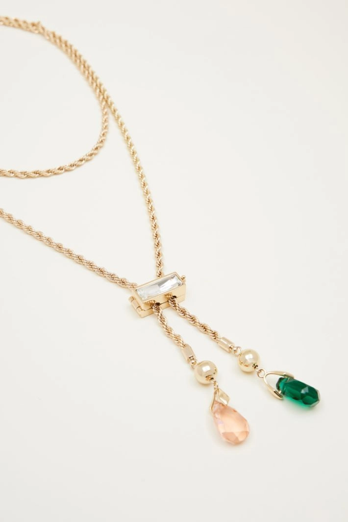 Collar con cadena salomónica con pedrería, ajustable y con terminales de gotas facetadas bicolor.