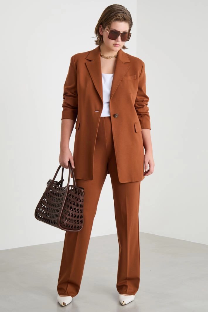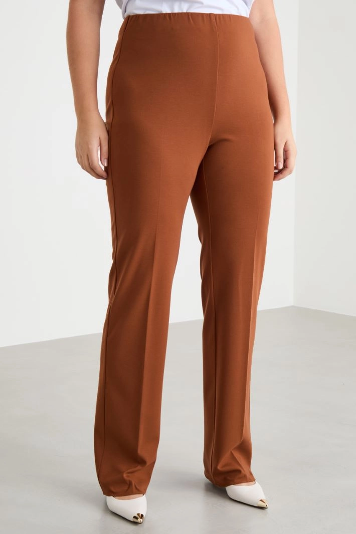 Pantalón de corte recto realizado en punto de viscosa con inserción elástica en la cintura. Cierre con cremallera en la espalda.