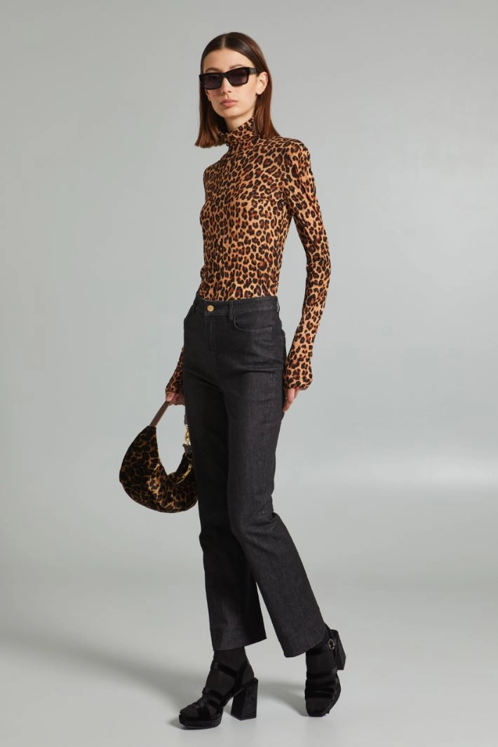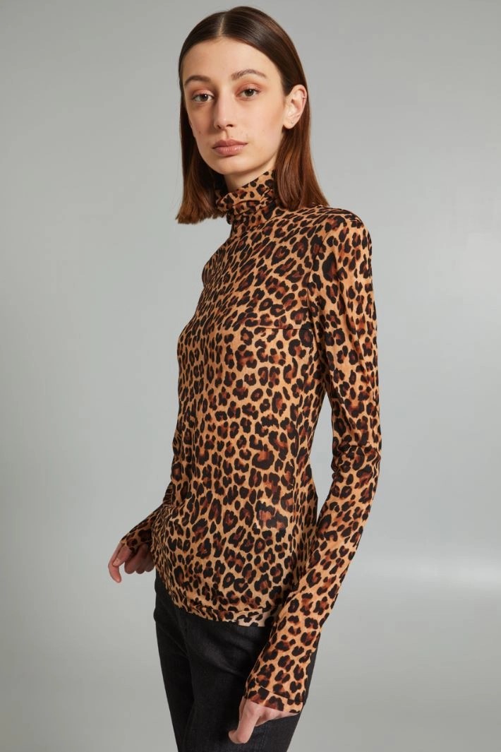 Jersey de cuello de cisne, de corte ajustado, realizado en punto de media estampado, con cuello alto y mangas largas.