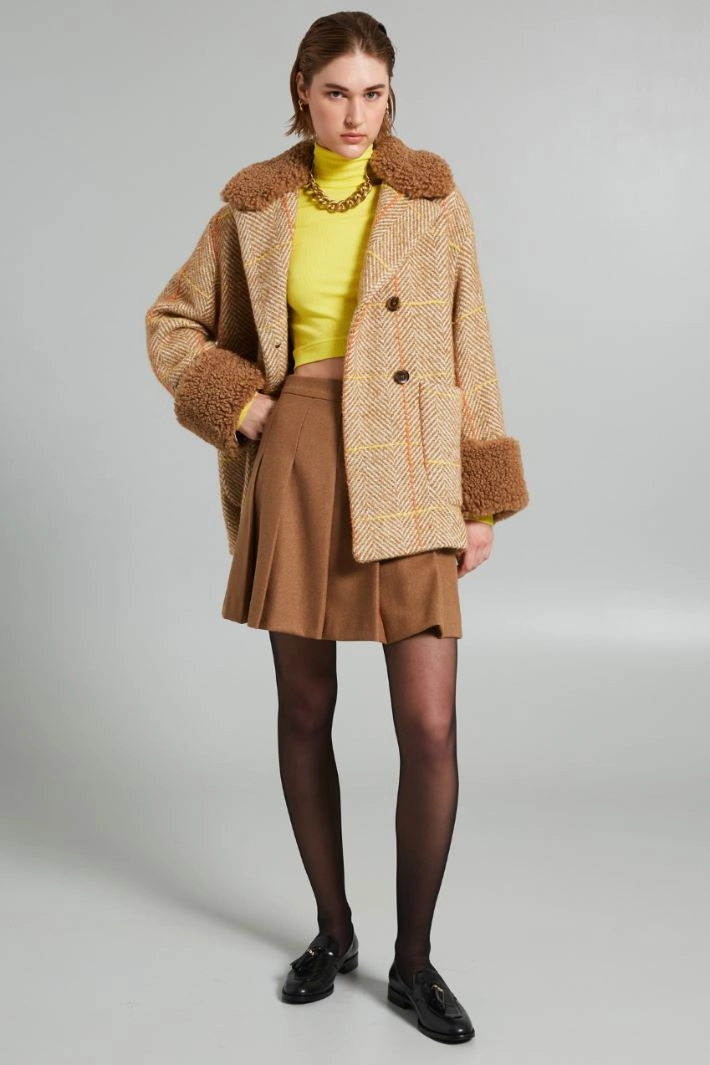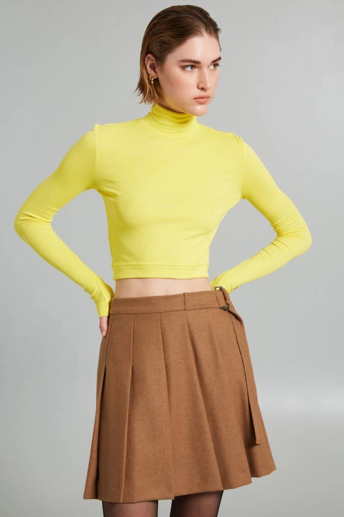 Jersey cropped, de cuello de cisne y corte ajustado, realizado en punto de viscosa elástica, con diseño acanalado, cuello alto y mangas largas.