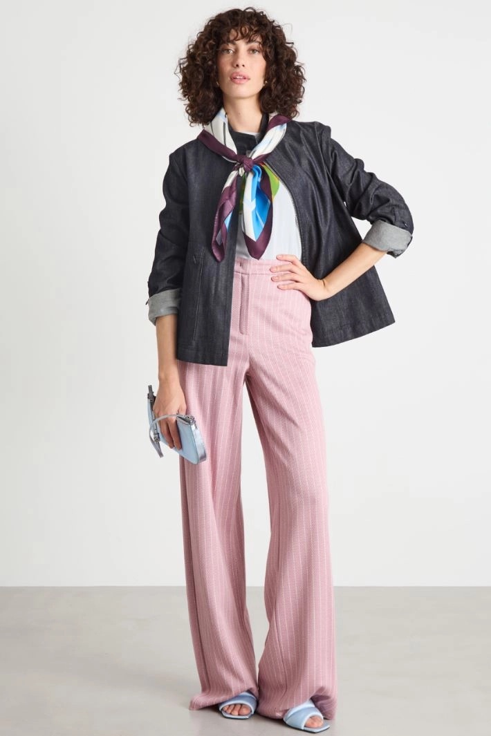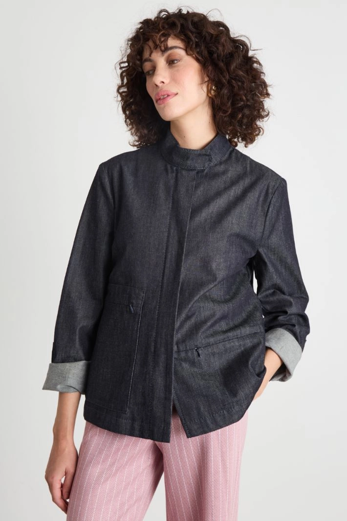 Cazadora de corte recto realizada en denim, con cuello alto, mangas largas y bolsillos asimétricos con cremallera. Sin forro. Cierre con cremallera.