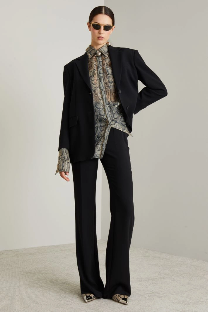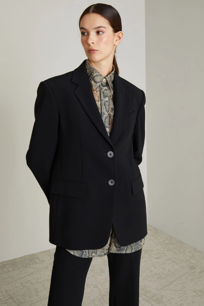 Blazer de corte recto realizado en cady, con cuello solapa, manga larga, bolsillos laterales de doble ribete con solapa y cierre sencillo con botones. Forrado.