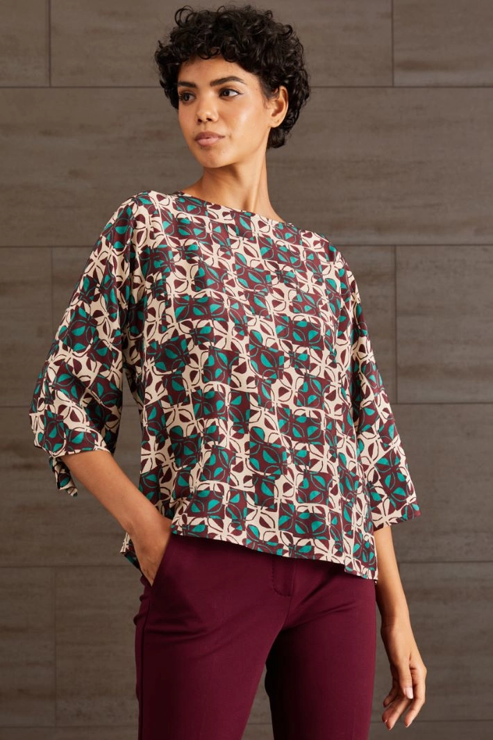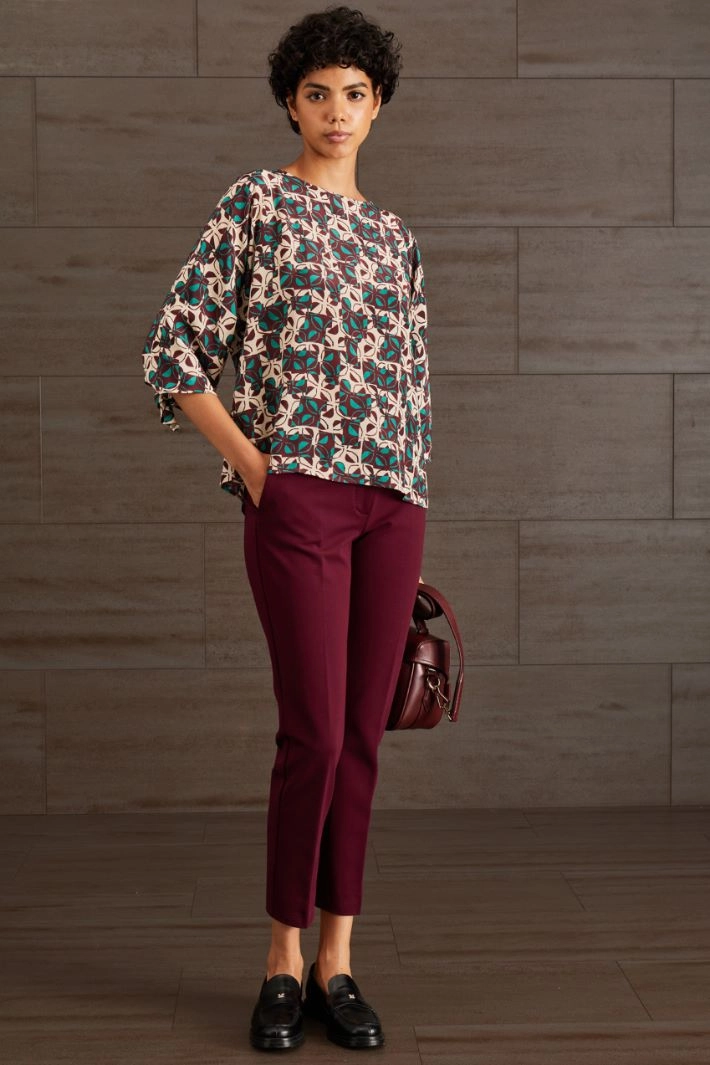 Blusa de corte fluido realizada en crepé de chine de seda pura estampada, con cuello redondo, mangas de tres cuartos extremos para anudar en la parte inferior, y abertura con botón en la parte trasera.