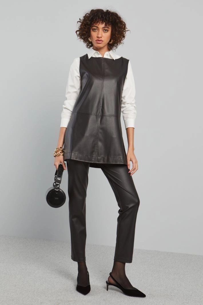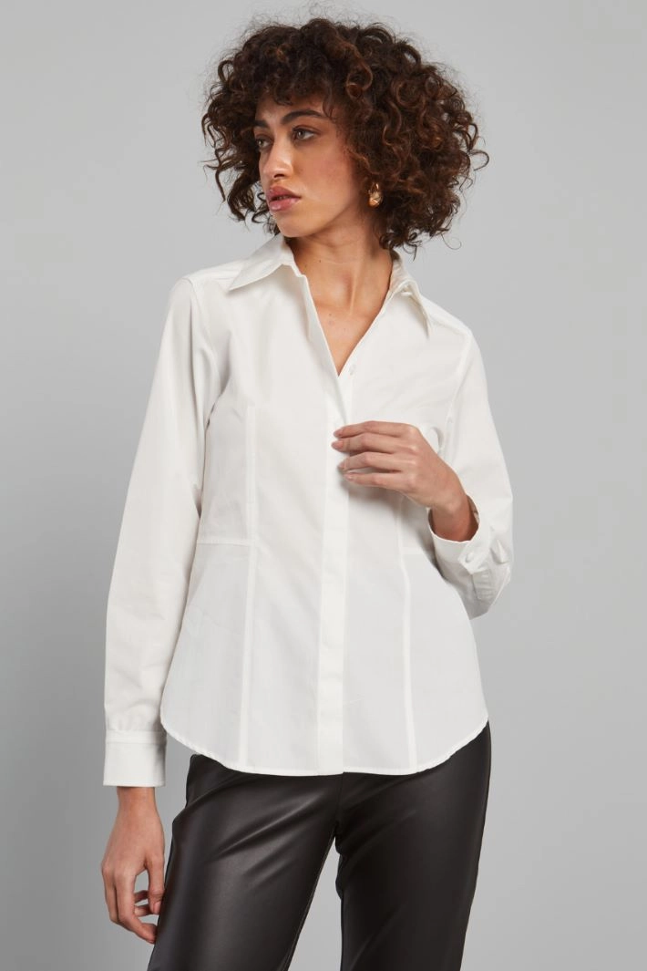Camisa de corte entallado realizada en popelina de algodón puro, con cuello clásico, mangas largas con puño y botón forrado, y canesú en la parte trasera. Cierre de botones oculto.