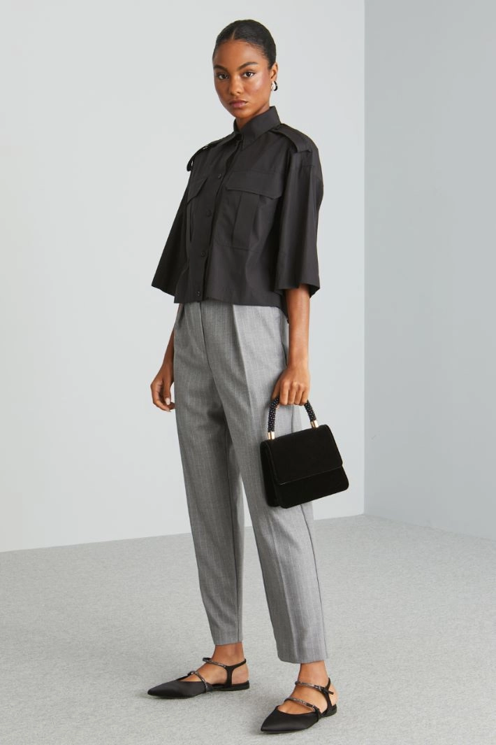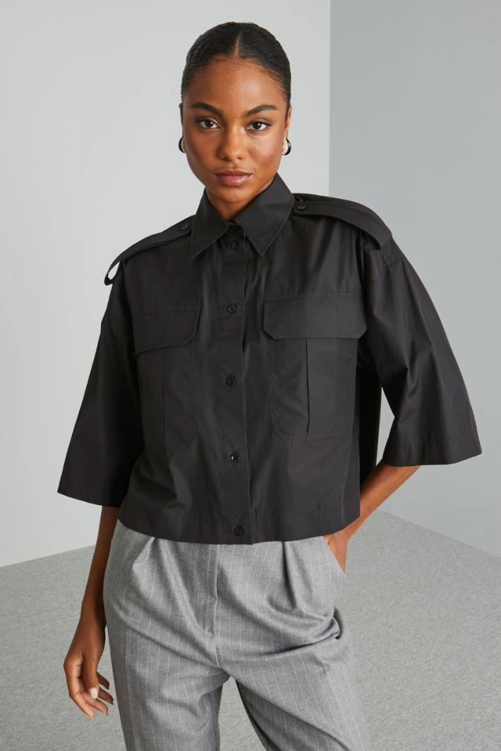 Camisa cropped realizada en tejido de algodón puro y adornada con detalles de estilo utilitario, hombros decorados con alamares, los bolsillos con solapa, aplicados en el pecho, mangas anchas y cortas, canesú en la espalda y cierre delantero visto.