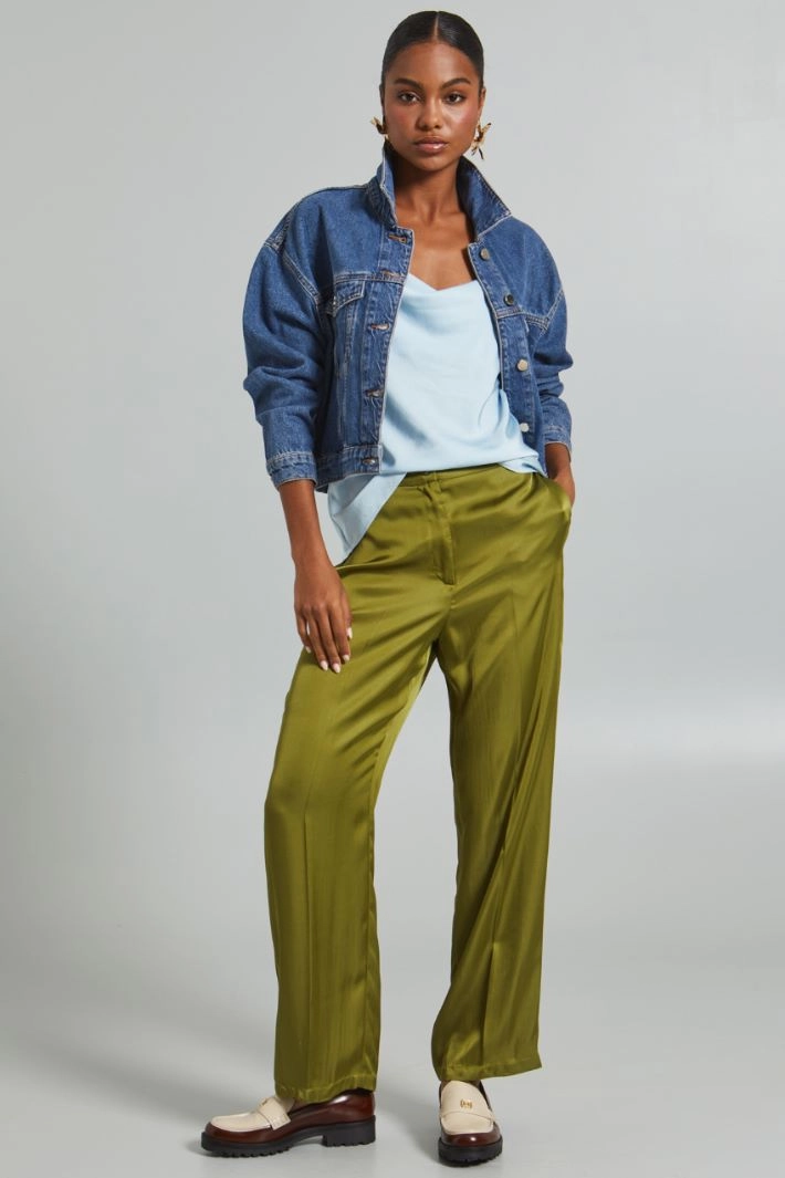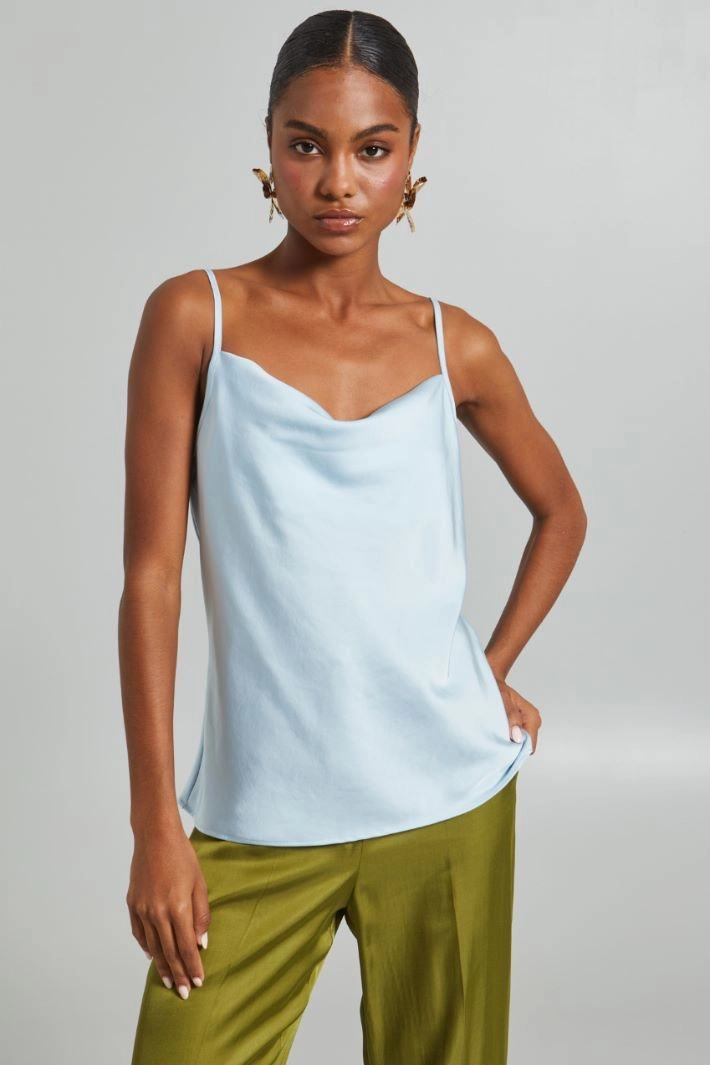 Top de corte fluido realizado en satén, con escote drapeado y tirantes finos.
