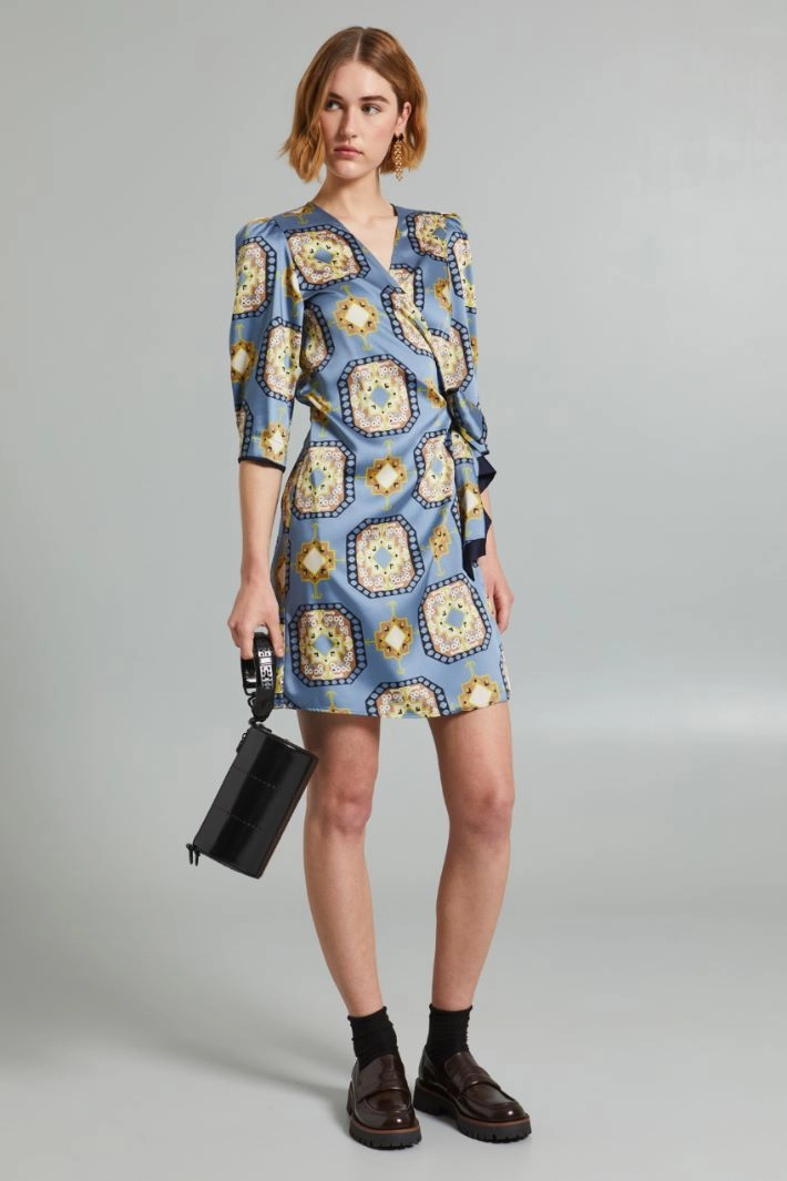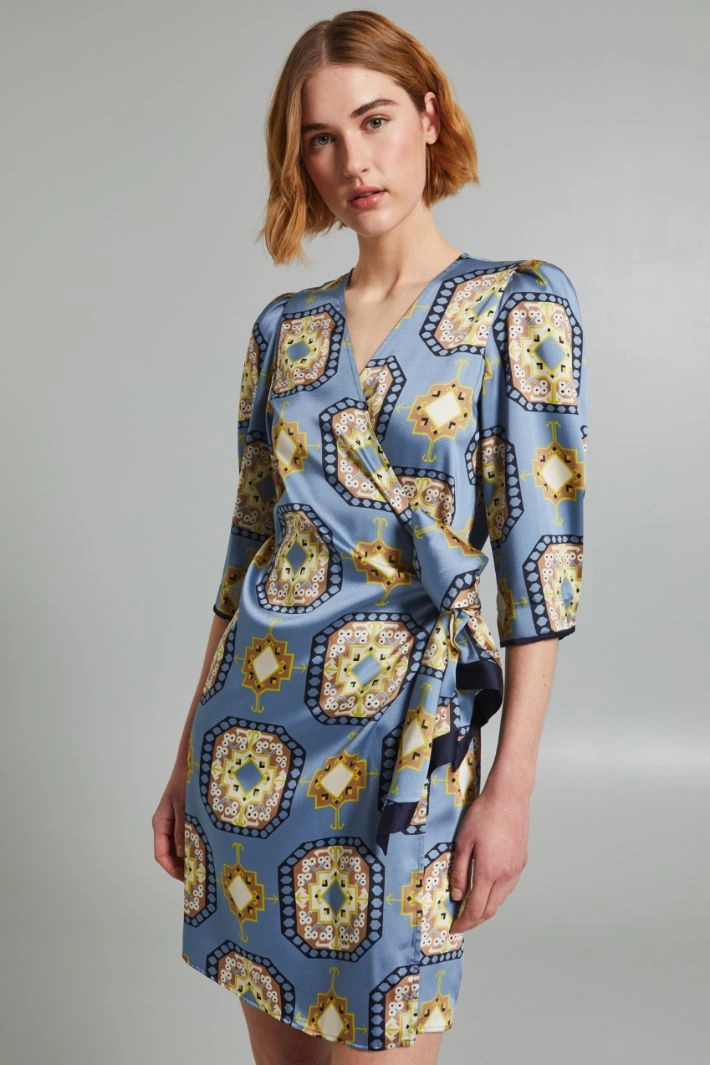 Vestido cruzado realizado en sarga all over estampada, con escote en pico cruzado, manga tres cuartos abullonada con botón y cierre con fajín para anudar en el lateral.