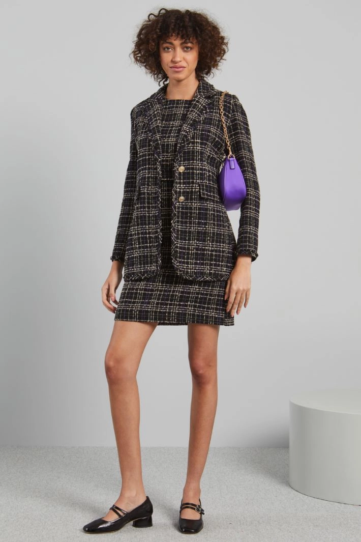 Vestido corto, de tubo, realizado en tweed de mezcla de algodón, con cuello redondo, mangas mariposa y detalle de botones joya en la parte delantera. Cierre con cremallera invisible en la parte trasera.
