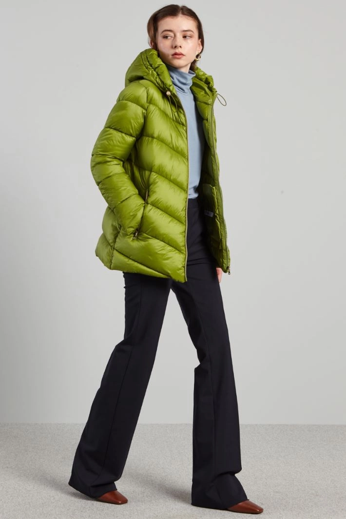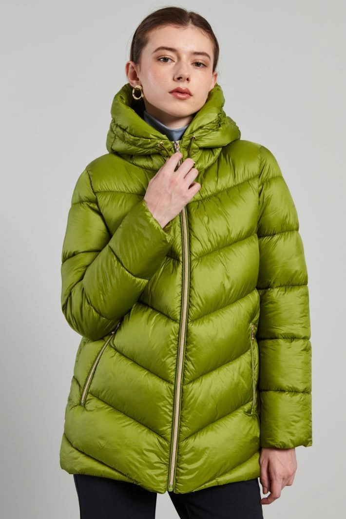 Anorak de corte recto realizado en satén técnico acolchado, con capucha y cordón ajustable en el borde, mangas largas y bolsillos insertados en la costura con cremallera. Cierre simple con cremallera.