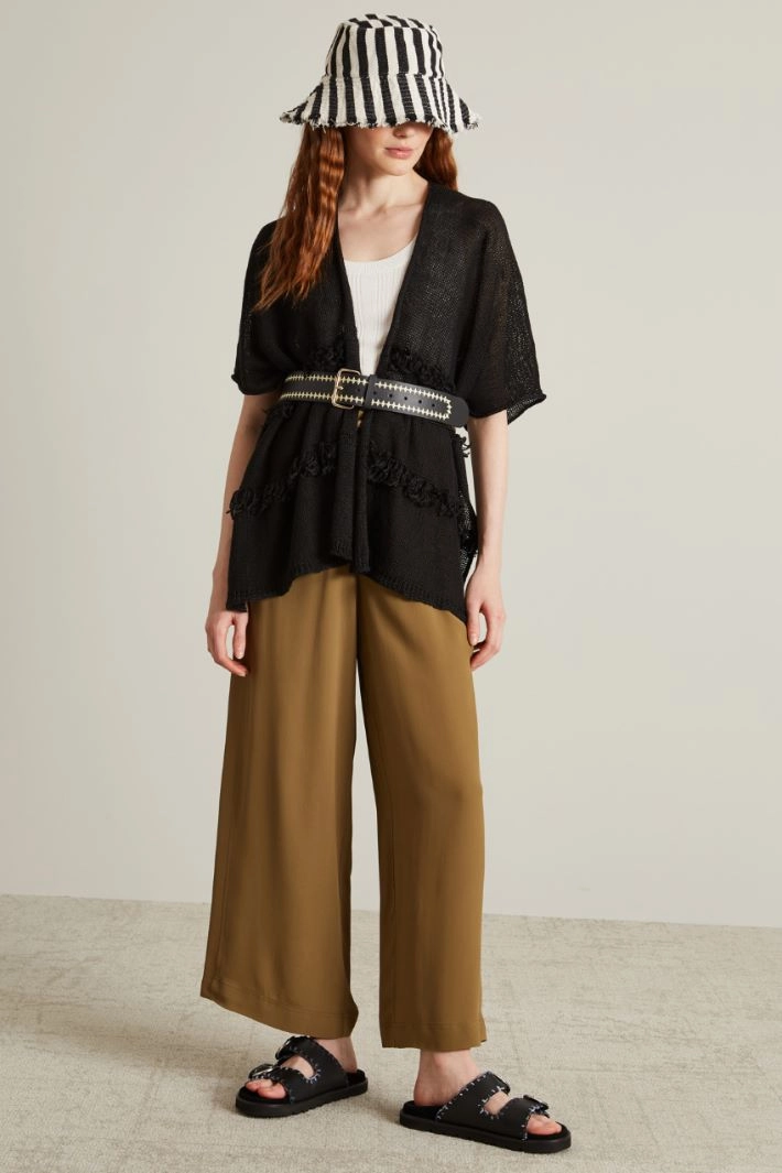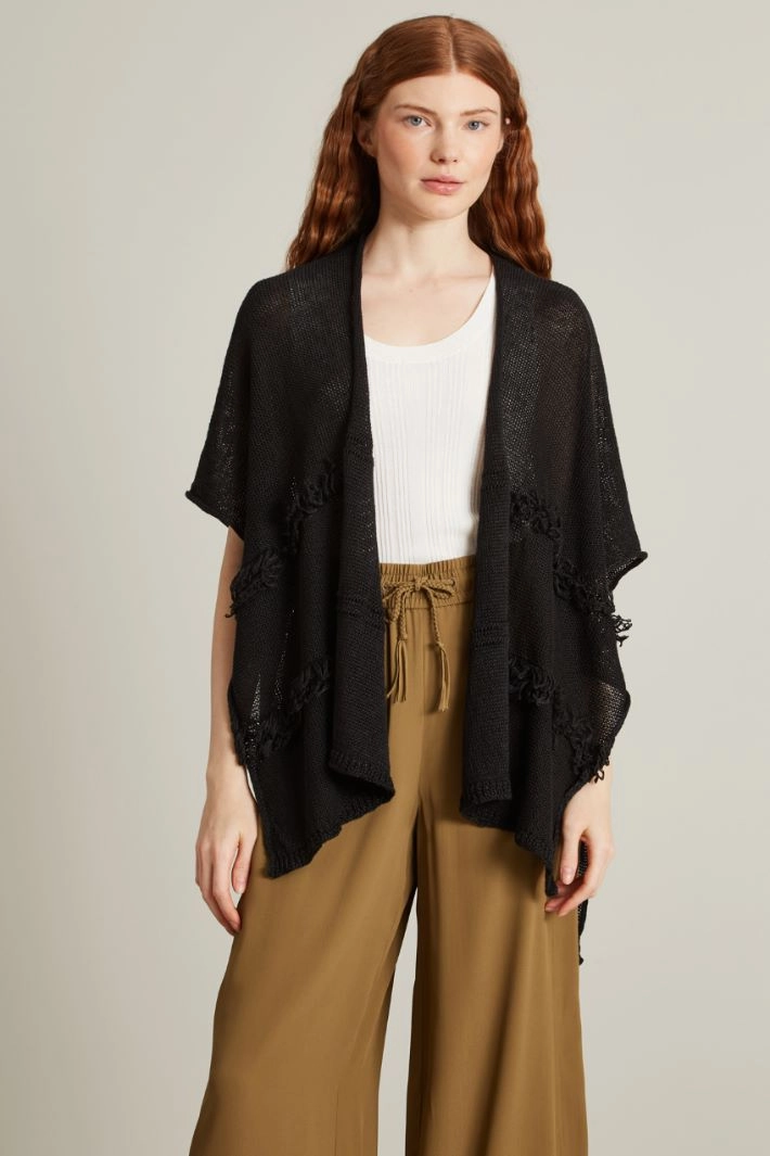 Cárdigan de corte suave realizado en lino, mangas cortas tipo kimono y motivos de flecos en el bajo.
