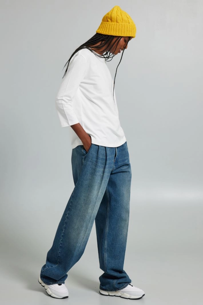 Camiseta de corte recto realizada en punto de algodón elástico, con cuello redondo, mangas tres cuartos y bajo con pequeñas aberturas laterales.